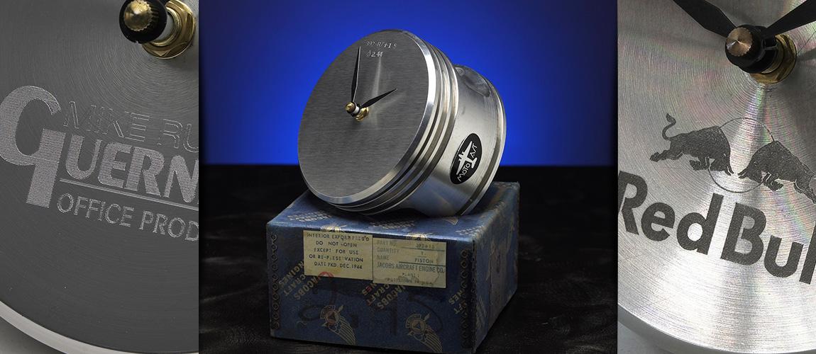 MotoArt Rule #1 - No clocks! But after finding 5,000 new 1940's era Jacobs radial engine pistons, we had to figure out something to do with them. Thus, was born our very cool DeskWatch. These dead stock new pistons are machined at a 60-degree angle for easy reading.