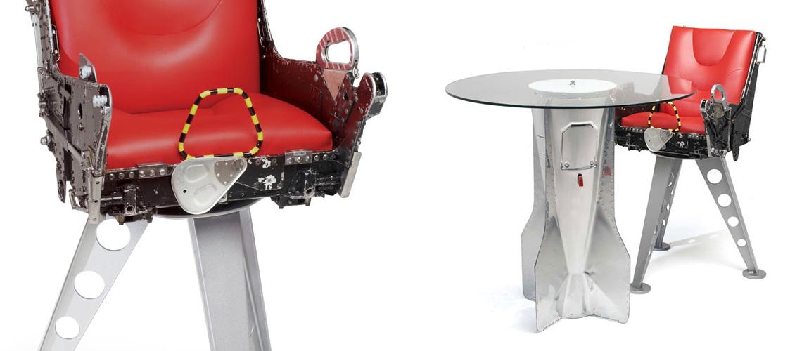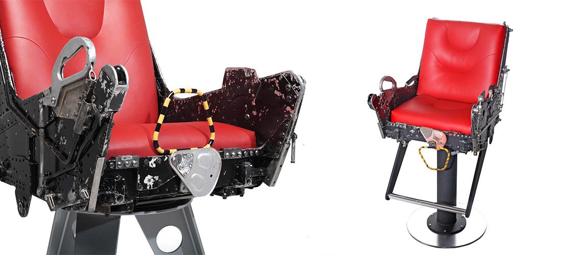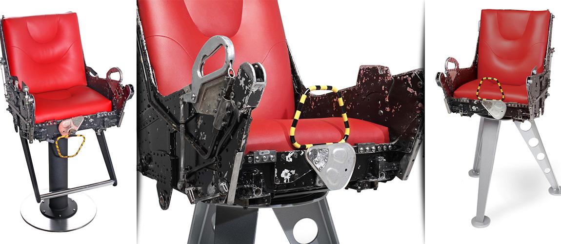 The F-4 Ejection Bar Stool is designed using the original bucket seat from an F-4 Phantom Jet Fighter. Our workmanship includes utilizing the original paint with highlighted accents and high performance upholstery. The F-4 ejection seat is supported by custom fabricated aluminum legs that are powder coated Reflective Silver.