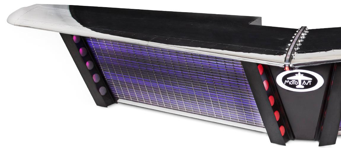 After hundreds of hours in the MotoArt shop, the G2 Wing Bar is a glimmering aesthetic masterpiece. With a marquee face made of industrial aluminum grating, backed by a perforated aluminum & white plexiglass lens, the façade of the bar is funky, sexy and altogether appealing. If that weren’t enough, designers Donovan Fell and Dave Hall also incorporated a multi programmable LED system that brings it all to another level.