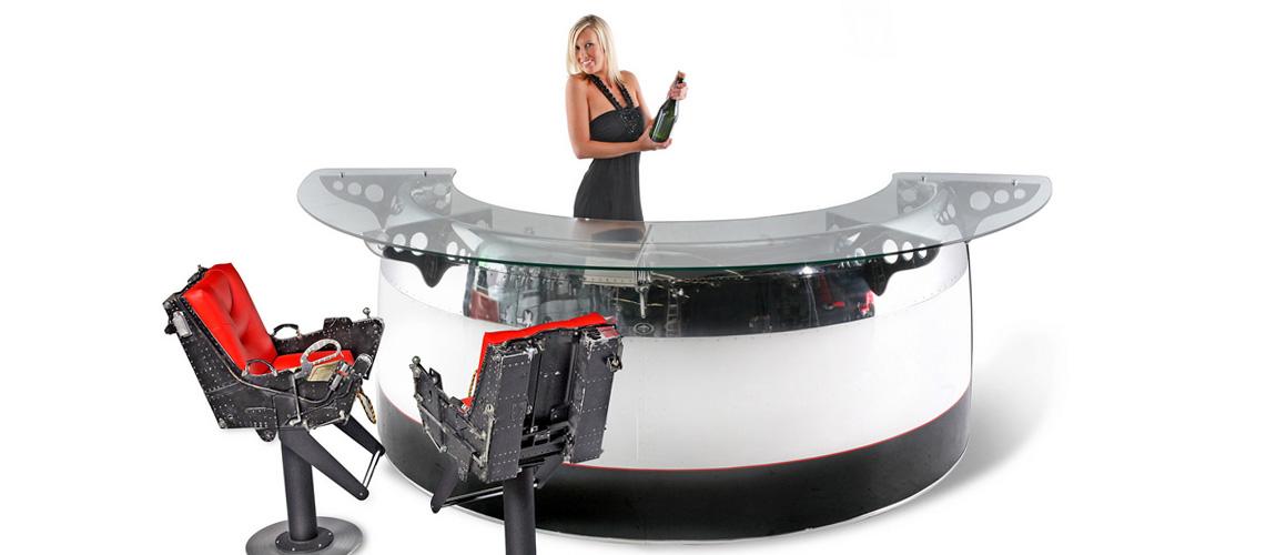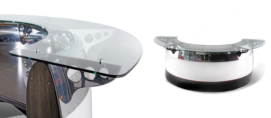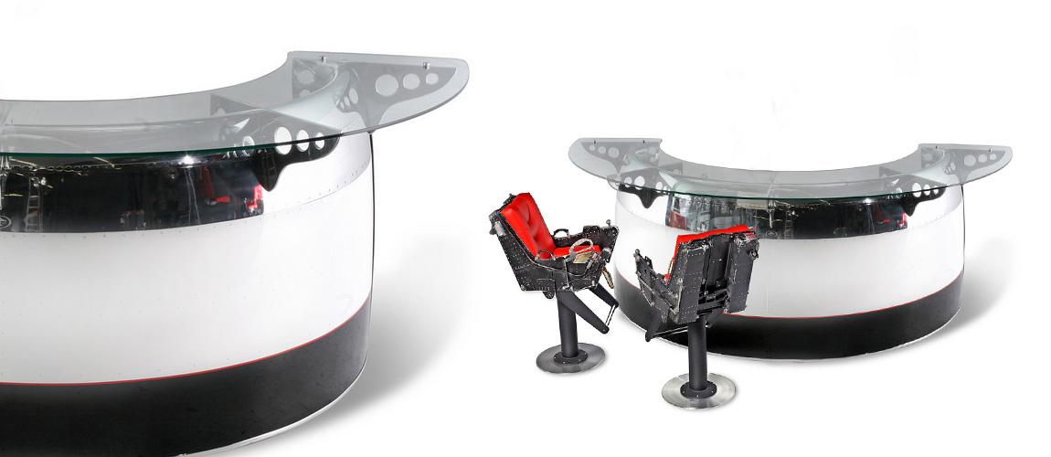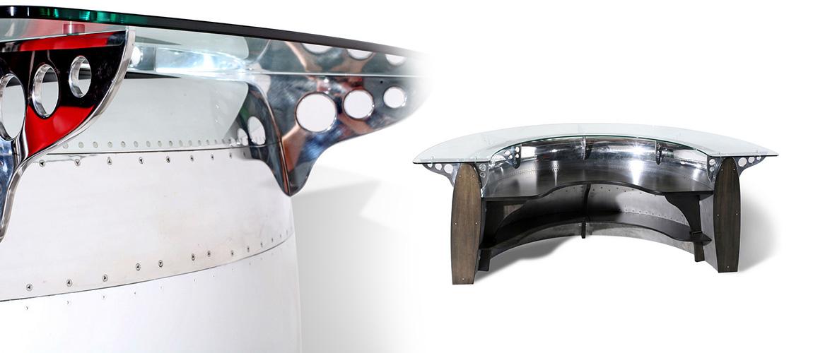 Fashioned from the engine cowling of the ultra-iconic Boeing 747, it is a shining example of MotoArt’s uncanny talent for repurposing and reforming retired aircraft parts into gorgeous contemporary handcrafted furniture. The inherent shape of the cowling is alluring and each custom fabricated piece includes a 1/2” tempered glass top, supported by mirror polished aluminum stand-offs that integrate seamlessly. Behind the bar is a handy well-placed hardwood counter top with bottom shelves for storage.