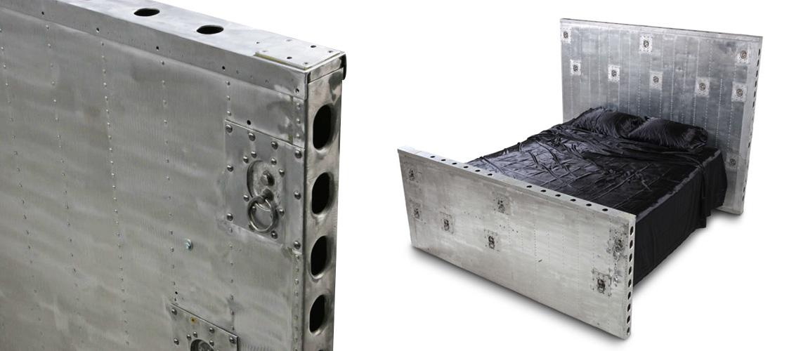 Strap yourself in for the ride of your life. The C-124 Cargo Bed has all the right hooks to make most people blush. Constructed from two authentic cargo floors, it includes the original tie-down rings that once strapped down tons of precious military cargo. Each bed frame is custom cut to accommodate the bed size of your choice. Sanded to a raw finish, it includes a leather padded footboard with extra hooks. Mattress, straps, chains and handcuffs are not included.