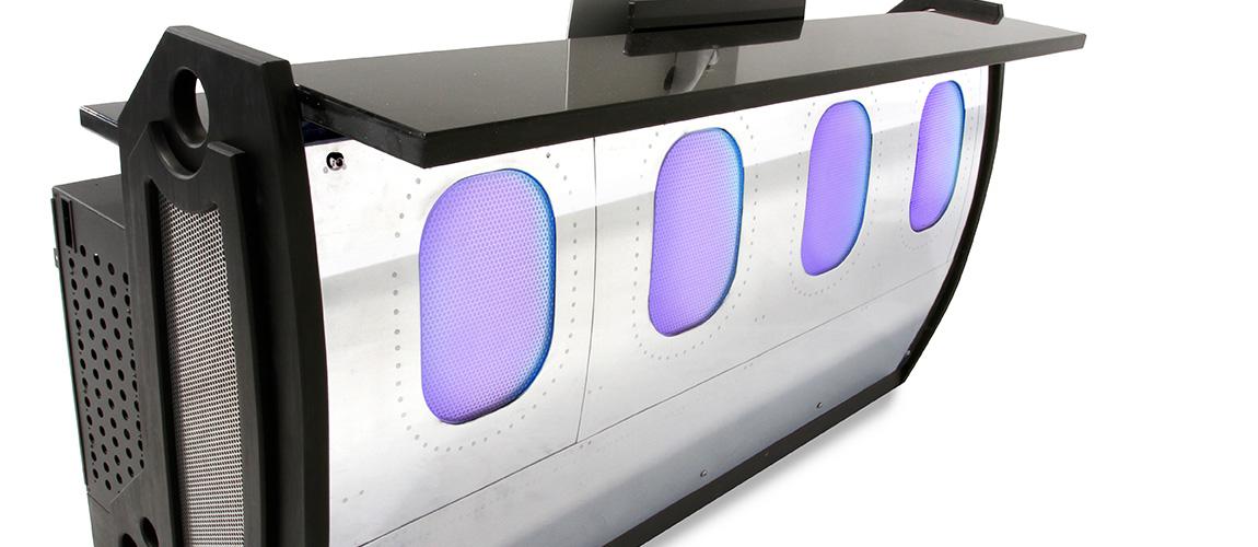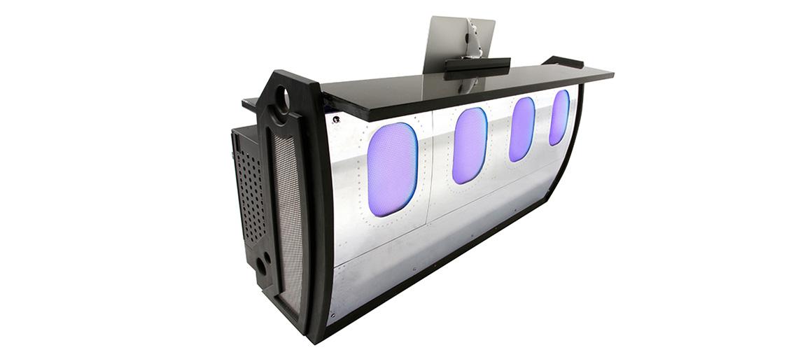 Interestingly, with little modification, the Fuselage Reception Desk can also double as a personal or company bar. In both identities, this piece sets the stage and sets it well. With optional LED lighting for the windows the Fuselage Reception Desk can be an outstanding element for any modern workspace.