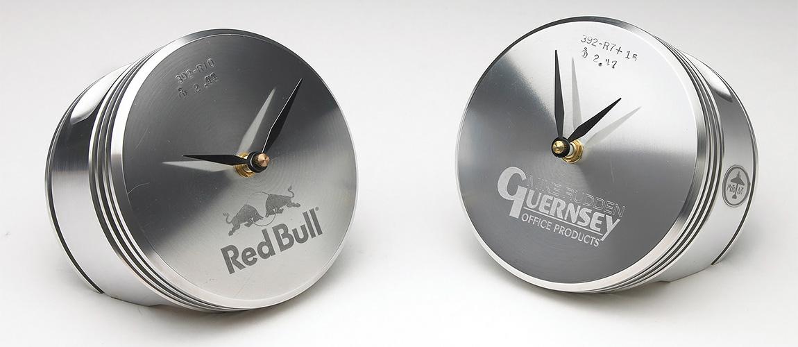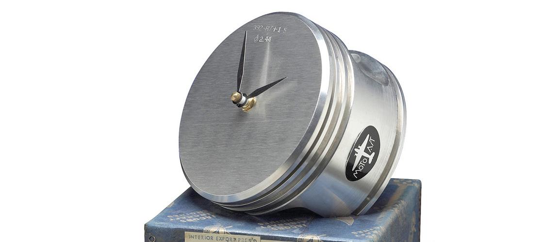 MotoArt Rule #1 - No clocks! But after finding 5,000 new 1940's era Jacobs radial engine pistons, we had to figure out something to do with them. Thus, was born our very cool DeskWatch. These dead stock new pistons are machined at a 60-degree angle for easy reading.