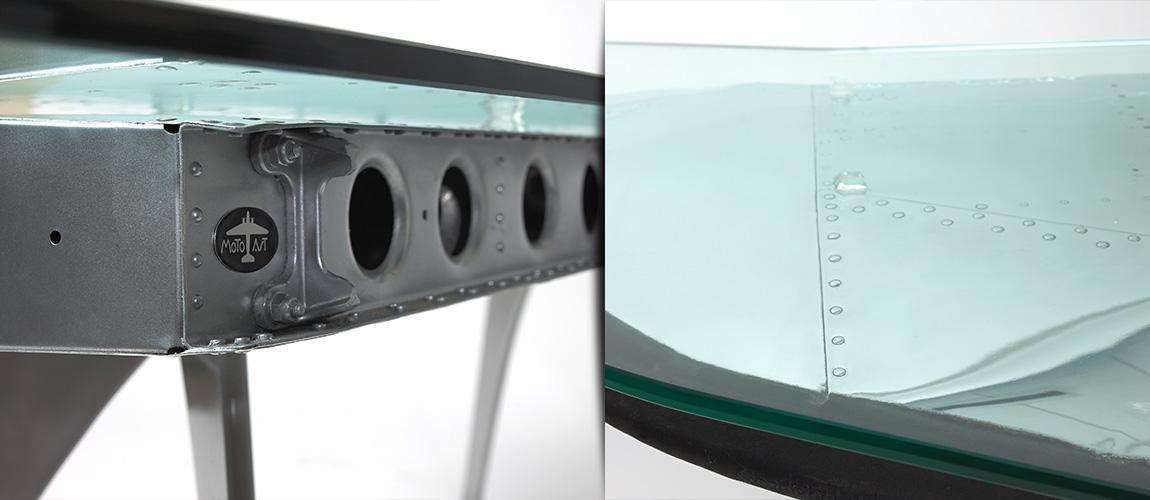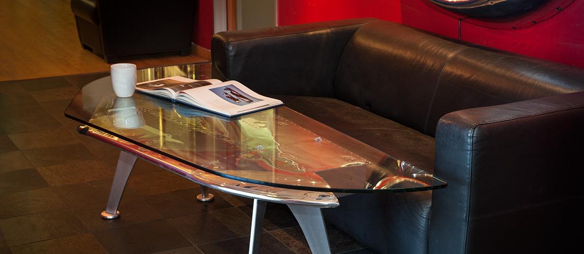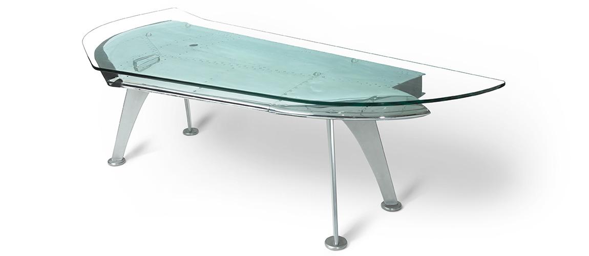 Place decades of aviation history in your living room or office with our new Beech 18 Coffee Table. The Beechcraft Model 18 was made from 1937 -1969 and served corporate, military and the flying public with timeless style. Designed and made using an authentic twin tail vertical stabilizer, MotoArt has stylishly created aluminum legs to compliment the design of the airframe. Available in authentic, satin or mirror polish finishes, these historical coffee tables are a great entry level piece for the MotoArt aficionados