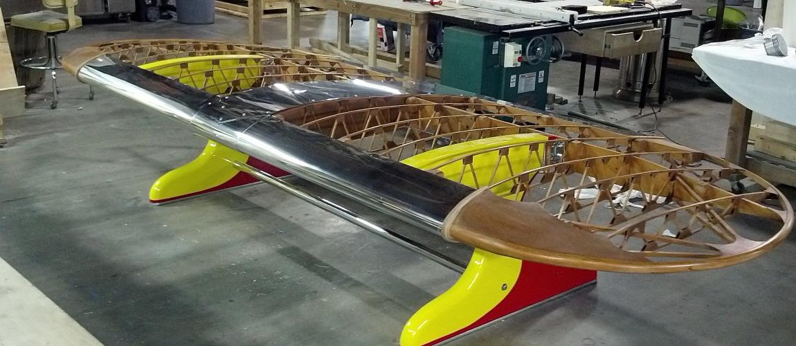The table can be custom-sized in lengths to fit most any conference room – the largest being 24'. As for color, the featured table appears in yellow, black and silver - a sophisticated and refined color scheme well suited for many office surroundings, but the client may determine the final colors of the wooden spruce spars and base support legs. The polished leading edge and trim-work inherently flatter whatever color the table becomes. Finishing touches include a tasteful custom sheet of 1/2" tempered glass that maintains the shape of the wing while providing a corporate elegance that will resonate long after the meeting is complete.