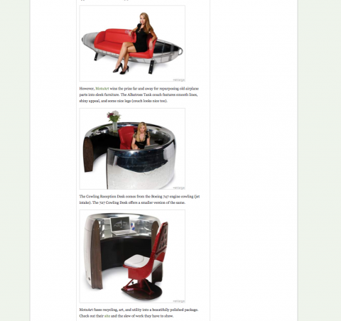 MotoArt wins the prize far and away for repurposing old airplane parts into sleek furniture. The Albatross Tank couch features smooth lines, shiny appeal, and some nice legs (couch looks nice too).